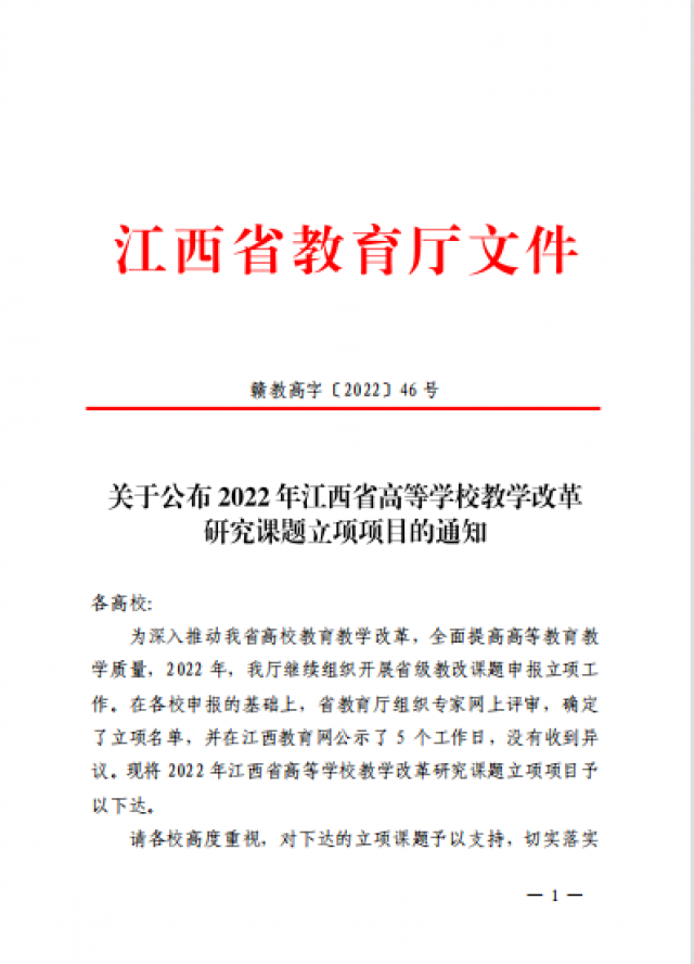 (图/文 教务处习军)近日,江西省教育厅公布了2022年江西省高等学校教学改革研究课题立项项目,我校获批25项省级教改课题,其中重点项目4项,项目立项率达83.33%(排全省第二),重点项目数较上年增长300%,在立项总数及重点项目数上均取得了历史性突破。
