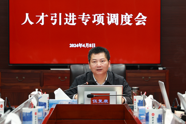 4月8日上午,学校在三楼党委会议室召开人才引进工作专项调度会。党委书记伍复康主持会议并讲话。校党政班子成员徐忠麟、陈裕先、龚丽春、刘力恒出席会议。相关二级学院、部门负责人参加会议。