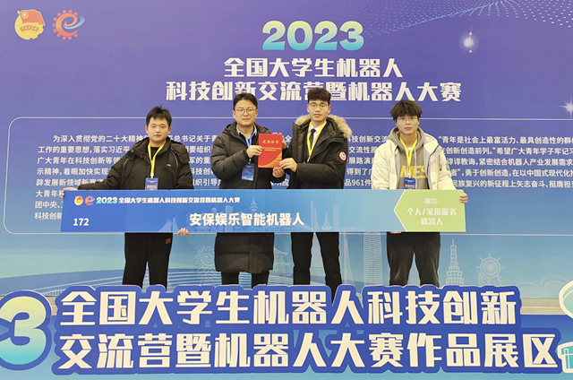据悉,本次大赛分为工业机器人、个人/家用服务机器人、公共服务机器人、特种机器人和其他应用领域机器人五个赛道。参赛过程中,项目成员通过现场路演的方式向评委、各校参赛成员进行展示,并与来自不同高校的参赛选手进行交流。由张宝、朱雪璇、严智敏老师指导张潇鑫、张杰、周斌等同学完成的参赛作品《安保娱乐智能机器人》获得全国一等奖。张宝、周京、李倩倩老师指导,周斌、张杰、张潇鑫等学生完成的参赛作品《“柔中带刚”——半柔体多功能家庭助手》获得全国三等奖。
