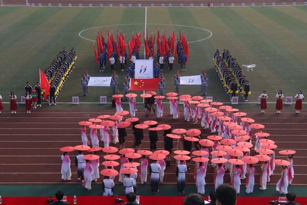 伴随着铿锵有力的运动员进行曲,国旗、奥林匹克旗、会旗、会徽、彩旗方阵、鲜花队、各二级学院代表队及教工队、裁判员方阵队相继入场。整齐划一的方阵、坚定有力的步伐赢得了现场观众的阵阵喝彩。各方阵队独具特色,将现代元素与传统元素相结合,以舞龙、汉服、体育舞蹈、花伞等形式为观众带来一场视觉盛宴。队员们英姿飒爽,斗志昂扬,传递着青春风采,释放着青春活力。