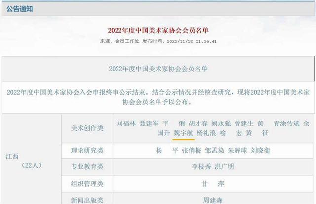 11月30日,2022年度中国美术家协会入会申报终审公示结束,经中国美术家协会公示, 民进会员、新余学院老师魏宇航加入中国美术家协会,会员类别为美术创作类。