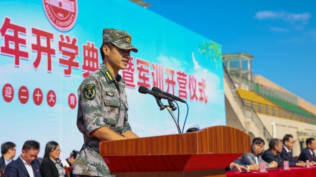 (文、图/新闻中心 学生记者 胡书奇 杨骏 梁嘉敏)10月10日上午,我校在南田径运动场举行2022级新生开学典礼暨军训开营仪式。校党政班子成员李明斌、张玉清、陈裕先、李敏、龚丽春、刘志勇、姚伟、周文生、曾浩武及军训教官代表出席开营仪式,各二级学院负责人及5000余名新生参加此次仪式。校党委书记李明斌宣布新余学院2022级新生军训开营。仪式由副校长李敏主持。