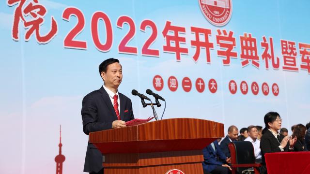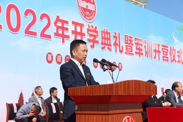 伴随着庄严的国歌声,仪式正式拉开帷幕。校长张玉清代表学校对2022级新同学的到来表示热烈欢迎和诚挚问候。就如何度过大学时光,张玉清要求:一是突破“旧我”,做与时俱进的奋进者;二是探索“新我”,做砥砺前行的开拓者;三是追求“大我”,做逐梦远航的奉献者 ,同学们要以实现中华民族伟大复兴为己任,把强国之志融入个人理想,把爱国之情转化为求知之行,努力成为堪当民族复兴重任的时代新人。为期两周的军训即将开始,张玉清希望同学们始终牢记习近平总书记的谆谆教导,做“有理想、有追求、有担当、有作为、有品质、有修养”的新时代大学生,始终谨记“求新 求实 求善”的校训精神,在军训中提高政治觉悟,激发爱国热情,增强国防观念和强化组织纪律,勤奋学习、砥砺奋进,奋力书写属于自己的青春华章。
