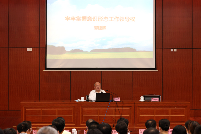 郭建晖以《牢牢掌握意识形态工作领导权》为主题,从深刻领会意识形态的丰富内涵、充分认识做好意识形态工作的极端重要性、准确把握当前意识形态领域的形势、守正创新做好新形势下的意识形态工作等方面进行了深入浅出的阐述。报告主题鲜明、内涵丰富,既富有理论指导性,又有很强的现实针对性,对于学校认清形势、把握重点、明确思路、细化举措、牢牢掌握意识形态工作领导权具有重要指导作用。