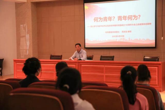 陈裕先以《心怀“国之大者” 践行“五个模范” 争做新时代好青年——深入学习习近平总书记在庆祝中国共产主义青年团成立100周年大会上的重要讲话精神》为题,从何为“五个模范”、何为“国之大者”、思考与实践三个方面对习近平总书记的重要讲话精神进行学习和理解。陈裕先表示,心怀“国之大者”与践行“五个模范”是大国青年应有的青春底色,二者相辅相成,这体现了习近平总书记对青年成长成才规律的准确把握,饱含深意地表达了党和国家对青年一代的殷切期望,也为广大青年如何成为担当民族复兴大任的时代新人指明了奋斗目标。陈裕先强调,青年与使命同在,责任与梦想同行。他鼓励青年师生,坚定理想信念,筑牢信仰之基;培养优良品德,提升精神境界;丰富知识储备,做到广学博览;练就过硬本领,争当时代青年。