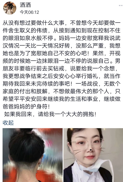 文中逆行出征的女护师张洒洒,便是我校护理与康复学院2015届护理专业优秀毕业生。在校期间,她曾担任班长,认真负责、为人踏实本分,非常刻苦用功,深得学院师生的喜爱。“来自河南的她,淳朴善良、待人随和,是同学们有口皆碑的“洒大姐”,是老师贴心的好帮手。”班主任庞承智如是说。学院院长吴玉华评价她是一个非常负责的同学,实习期间在上海担任医院实习组长,工作勤勤恳恳,带教老师非常满意。同学任兰英说:我们一起在上海度过了最辛苦的实习期。她就像一个大姐姐,特别会照顾人,是我的榜样。张洒洒大学期间在同济大学附属上海肺科医院实习,毕业后进入普陀区中心医院,2018年进入上海交通大学附属上海市第一人民医院国家重点临床专科呼吸与危重症医学科工作,现随上海第一人民医院援鄂医疗队对口支援雷神山医院。
