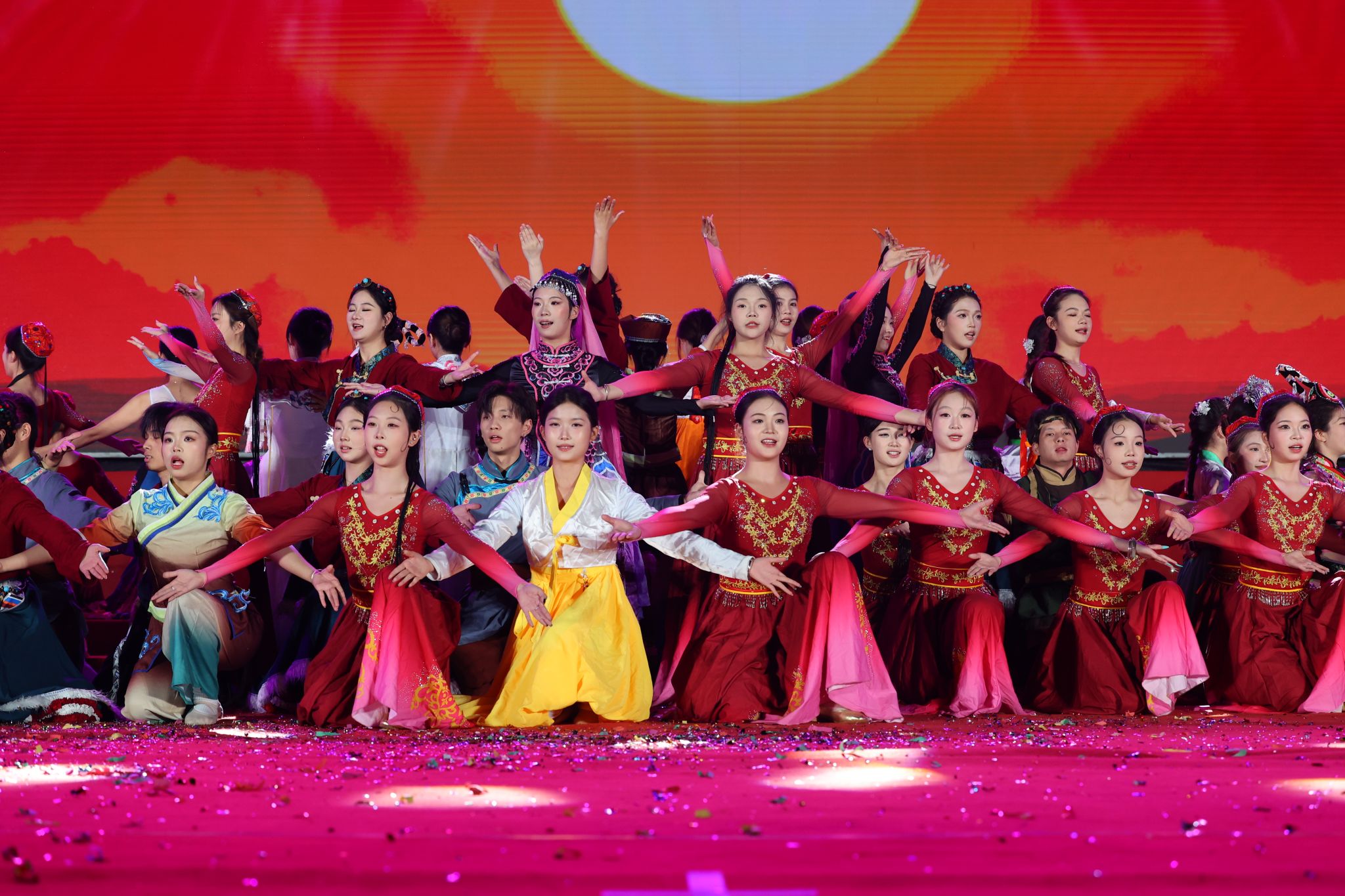 第四篇章“奋进”,由新余钢铁集团有限公司带来的舞蹈《携手铸辉煌》,以铿锵有力的舞姿,舞出携手并进的力量和共创未来的信心。访谈节目《致未来》,邀请老教师和校友分享成长轨迹与新院情结。他们的话语中,有回忆,有感恩,更有对新院未来的无限期待,他们的深情寄语,是沉甸甸的责任,更是催人奋进的号角。民族舞蹈《石榴花开》,以石榴为喻,象征各族师生像石榴籽一样紧紧抱在一起的生动场景。舞蹈热烈奔放,色彩绚斓,展现学校深入开展民族团结进步教育,铸牢中华民族共同体意识的生动实践的丰硕成果。