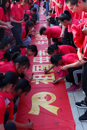 上午八时许,迎着朝阳,礼兵迈着整齐矫健的步伐护卫着鲜艳的五星红旗入场,鲜艳的五星红旗在雄壮有力的国歌声中冉冉升起,全体师生行注目礼,怀着自豪而激动的心情,高唱国歌,将爱国之情融入动人的旋律中,万人齐唱,歌声嘹亮,令人热血沸腾。“当国旗升起的那一刻,我的内心激动无比、感概万千,70年的锐意进取,70年的砥砺奋进,祖国大地越来越漂亮,人民生活越来越幸福。在此祝伟大祖国繁荣昌盛,明天更加美好”,活动现场的一名学子如是说。最后,全场师生们激情难抑,齐声高唱《歌唱祖国》,真诚表达了学校广大师生对党、对祖国的无限忠诚和热爱,对实现中华民族伟大复兴中国梦的坚定信心。现场气氛昂扬向上,歌声催人奋进,凝心聚力。随后,“我爱你,中国”万人签名活动正式开始。全体师生们一起参加万人签名活动,一笔一划都流露出对于祖国的热爱与祝愿,衷心祝福祖国繁荣昌盛、国泰民安。