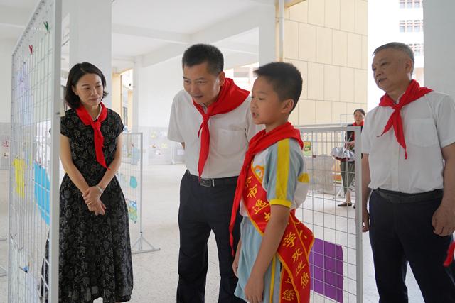 随后,伍复康来到“阅读书画艺术”学生作品展区,亲切与孩子们交谈,询问孩子们作品含义及创作过程。他指出:小学阶段是培养孩子阅读习惯和阅读能力的黄金时期,要让阅读成为一种生活习惯,希望孩子们养成阅读习惯,快乐阅读,健康成长;形成爱读书、读好书、善读书的浓厚氛围,同时对开展校园文化活动和社会主义核心价值观相结合表示肯定。