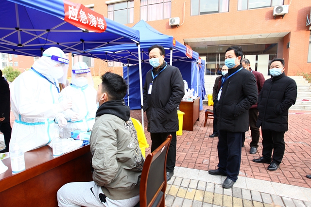 当天上午,王水平带队来我校观摩指导核酸检测工作。在检测点,王水平认真察看了学校核酸检测情况,详细了解核酸检测点设置、人员配备、物资储备及后勤保障等情况,叮嘱要规范程序流程,严格按照规程进行健康监测,并做好个人防护。校领导也先后来到各个采样点查看,对点位分布、隔离距离、工作展开等进行指导,对现场参加应急演练的医护人员和同学们表示慰问。