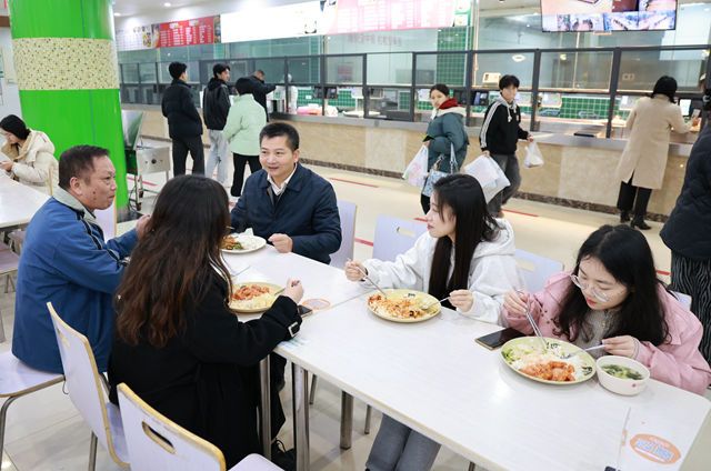 走访结束后,伍复康等领导来到第一食堂,与同学们一起端起盘子打饭,共同用餐。“一个月生活费要多少钱?”“食堂的饭菜性价比如何?”“平时喜欢到食堂吃还是点外卖?”在用餐期间,伍复康等领导与同学们亲切交流,讨论学习、生活等情况,并询问对食堂饭菜及学校管理的看法与建议。亲切入微的交谈、细致周到的关怀,让在座的每一位同学都倍感温暖,就餐气氛轻松愉悦。