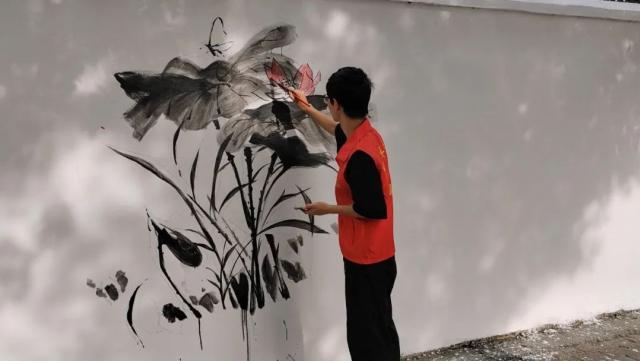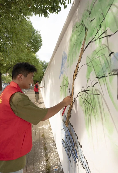 近日,我校艺术学院大学生志愿者们,他们身穿红马甲,头戴大草帽,手上拎着画笔、调色盘、洗笔桶等墙绘工具。在老师的带领下,大家分工合作,有的负责调色,有的则负责填色,人人拿着各式各样的画笔在白墙上涂抹着。勾线、上色、精修……经过绘制,墙面上人物、场景开始鲜活起来,一幅幅美丽的画面“跃然墙上”。