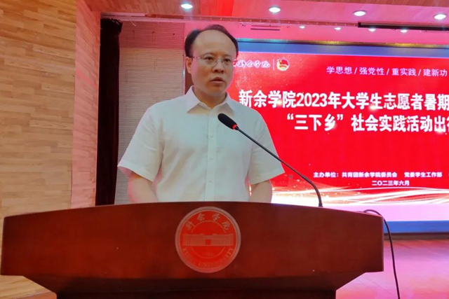 7月1日上午,我校在图书馆学术讲堂举行“学习二十大,永远跟党走,奋进新征程”2023年大学生暑期“三下乡”社会实践活动出征仪式。校党委副书记徐忠麟,校党委委员、副校长李敏,校党委委员、组织部部长周文生,党委学工部、教务处负责人及各二级学院党委副书记,各服务队指导老师与全体志愿者共同参与了此次出征仪式。