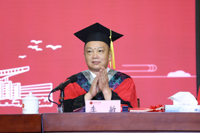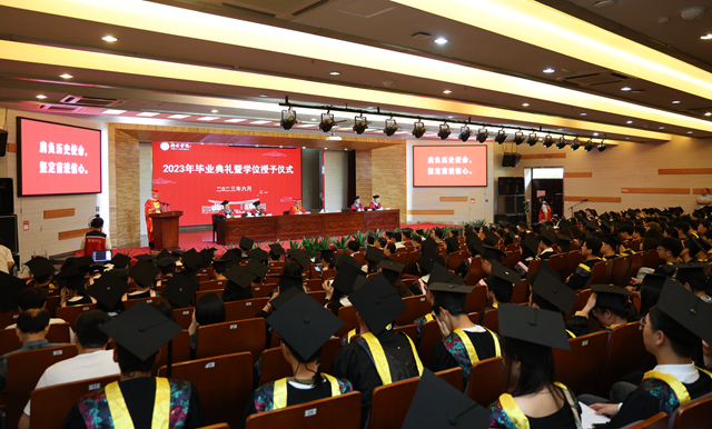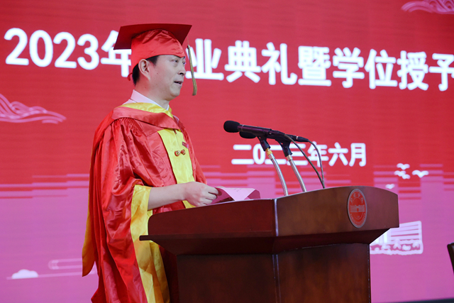 张玉清表示,2023年毕业生们的记忆是特殊而又不平凡的。同学们见证了新中国成立70周年、中国共产党百年华诞、党的二十大胜利召开的伟大历史时刻,也经历了三年疫情艰苦卓绝的历史大考。可喜可贺的是,同学们在挑战与机遇面前展现了“何妨吟啸且徐行”的淡定和从容,坚定了“长风破浪会有时”的信心和希望,奏响了“我与祖国共命运”的青春旋律和时代强音,为大学四年画上了圆满的句号。同学们用敢于竞争的勇气和智慧向学校、向自己、向家人交出了“百舸争流,奋楫者先”的高分答卷,用善于竞争的奋斗和汗水续写着校训“求新、求实、求善”的华美篇章。