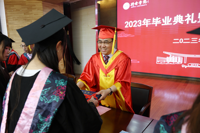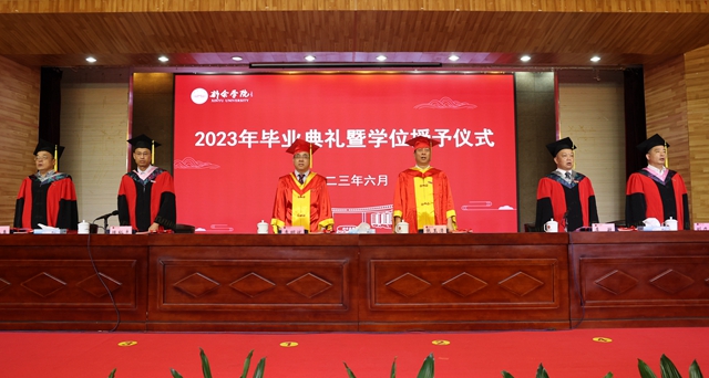 (文/党委宣传部 郭斓 图/新闻中心 杨骏 许传文) 6月9日上午9时,在庄严雄壮的国歌声中,新余学院2023年毕业典礼暨学位授予仪式在校图书馆学术讲堂举行。典礼采取线上线下相结合形式同步进行。在家的校领导李明斌、张玉清、陈裕先、李敏、刘志勇、刘力恒出席典礼,各二级学院、各部门负责人以及400余名毕业生代表参加典礼。校党委书记李明斌等领导为毕业生代表颁发毕业证书,为校友联络员颁发聘书。党委委员、副校长李敏主持典礼。场内毕业生们穿戴整齐,脸上洋溢着青春的笑容,与老师、同学共享毕业的激动与喜悦。近8万人通过微信视频号、微博、抖音号、微赞直播平台等媒体观看直播。