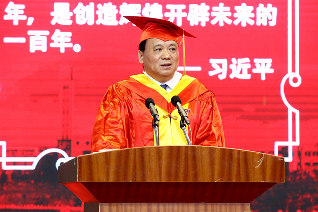 校党委书记刘冬向圆满完成学业的2021届毕业生表示热烈祝贺,向精心培育学生、为同学们倾注心血的老师、家长表示衷心的感谢和崇高的敬意。刘冬表示,2021年注定是一个非同寻常的年份,中国共产党迎来了百年华诞。同学们与伟大的时代同向同行,共同见证了中国共产党这个百年大党带领14亿人民脱贫攻坚取得伟大胜利和第一个百年全面建成小康社会奋斗目标的实现,并阔步迈向社会主义现代化建设的新征程。在这个伟大的时代,大家也参与、见证了学校的高质量发展。四年来,同学们在这所充满青春活力的校园,汲取知识智慧,书写阳光故事,锤炼了品德修养、夯实了专业基础、学会了做人处事。用勤奋铸就了学业、用创新点亮了生活、用汗水浇灌了梦想。