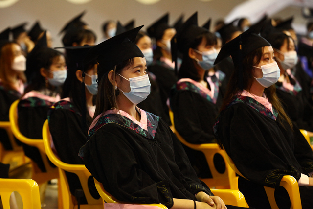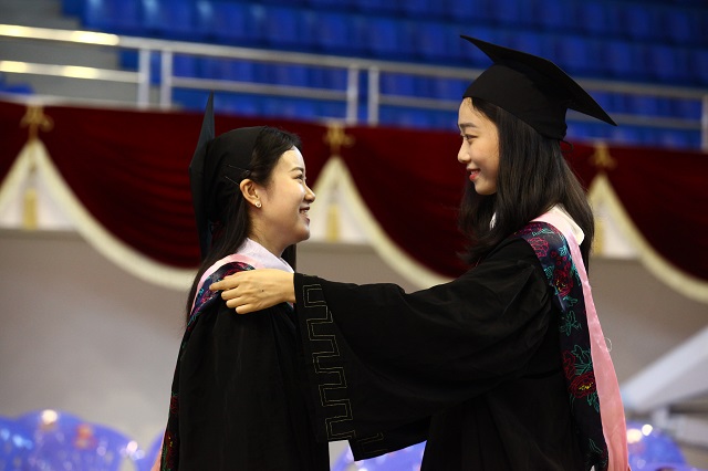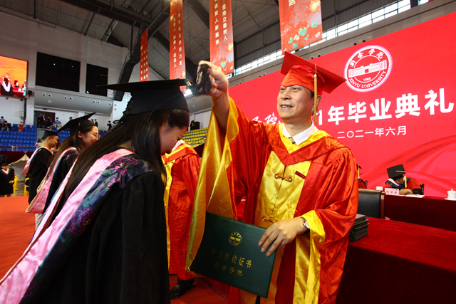 学位授予仪式上,身穿学位服的毕业生们依次上台从校领导手中接过学位证书,校领导为同学们授予学位、扶苏拨穗,并合影留念。最后,典礼在全体师生宏亮的校歌合唱中圆满落下帷幕。