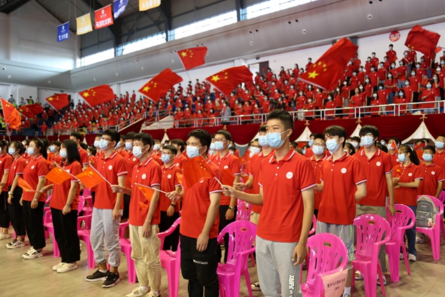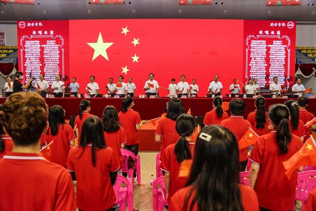 典礼结束时,现场师生共同挥舞着手中鲜艳的五星红旗,饱含深情的齐唱《歌唱祖国》,用歌声表达对祖国的热爱和祝福。