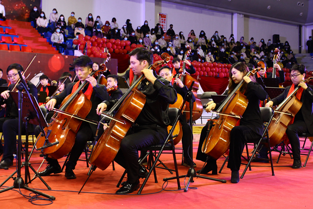 音乐会开始前,校党委书记刘冬发表新年致辞,他代表学校党委、行政,向全校师生员工、离退休老同志、广大校友,以及关心、支持我校发展的各级领导、各界朋友,致以诚挚的问候和良好的祝愿。刘冬表示,2020年是极不平凡、极不寻常的一年,也是极其不易的一年。这一年,学校全面加强党的领导,全面推进从严治党,积极开展“打造忠诚高校,锤炼忠诚品格”活动,政治生态呈现总体向好态势,党建和思想政治工作取得了较好成绩。这一年,面对新冠肺炎疫情,学校坚决贯彻落实习近平总书记重要讲话和重要指示批示精神,认真落实中央、省委的决策部署和市委要求,坚持把师生生命安全和身体健康放在第一位,把疫情防控作为学校的重大政治任务来抓,迅速行动,积极作为,统筹推进疫情防控和教育教学工作,取得重大战略成果。这一年,学校围绕建设特色鲜明的高水平应用型本科院校的目标,加大改革创新力度,努力破解发展瓶颈,在教学科研、师资队伍建设等方面取得了较好的成绩。刘冬表示,2021年,是我们党成立一百周年,是实现第一个百年奋斗目标之后,乘势而上开启全面建设社会主义现代化国家新征程、向第二个百年奋斗目标进军的开局之年,让我们更加紧密地团结在以习近平同志为核心的党中央周围,全面贯彻党的十九大和十九届二中、三中、四中、五中全会精神,增强“四个意识”,坚定“四个自信”,坚决做到“两个维护”,不忘初心,牢记使命,为党育人,为国育才,以优异成绩迎接建党100周年,为全面建设社会主义现代化国家、实现中华民族伟大复兴中国梦不懈奋斗。