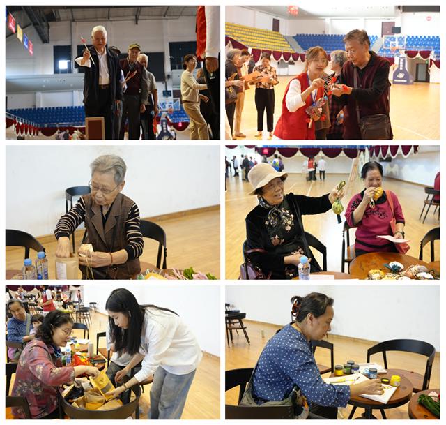 老同志们齐聚在学校室内体育馆参加“浓浓重阳情乐享游园会”活动,在游戏区大家兴致勃勃地参加了投壶、飞镖等趣味十足的活动;在体验区与手工制作社团成员一起制作香囊,大家分工有序,共同合作,暖意融融。在拍照打卡点,随着相机“咔嚓”声响起,大家神采奕奕,每一个幸福的瞬间都被定格成永恒。现场欢声洋溢,祥和温馨。