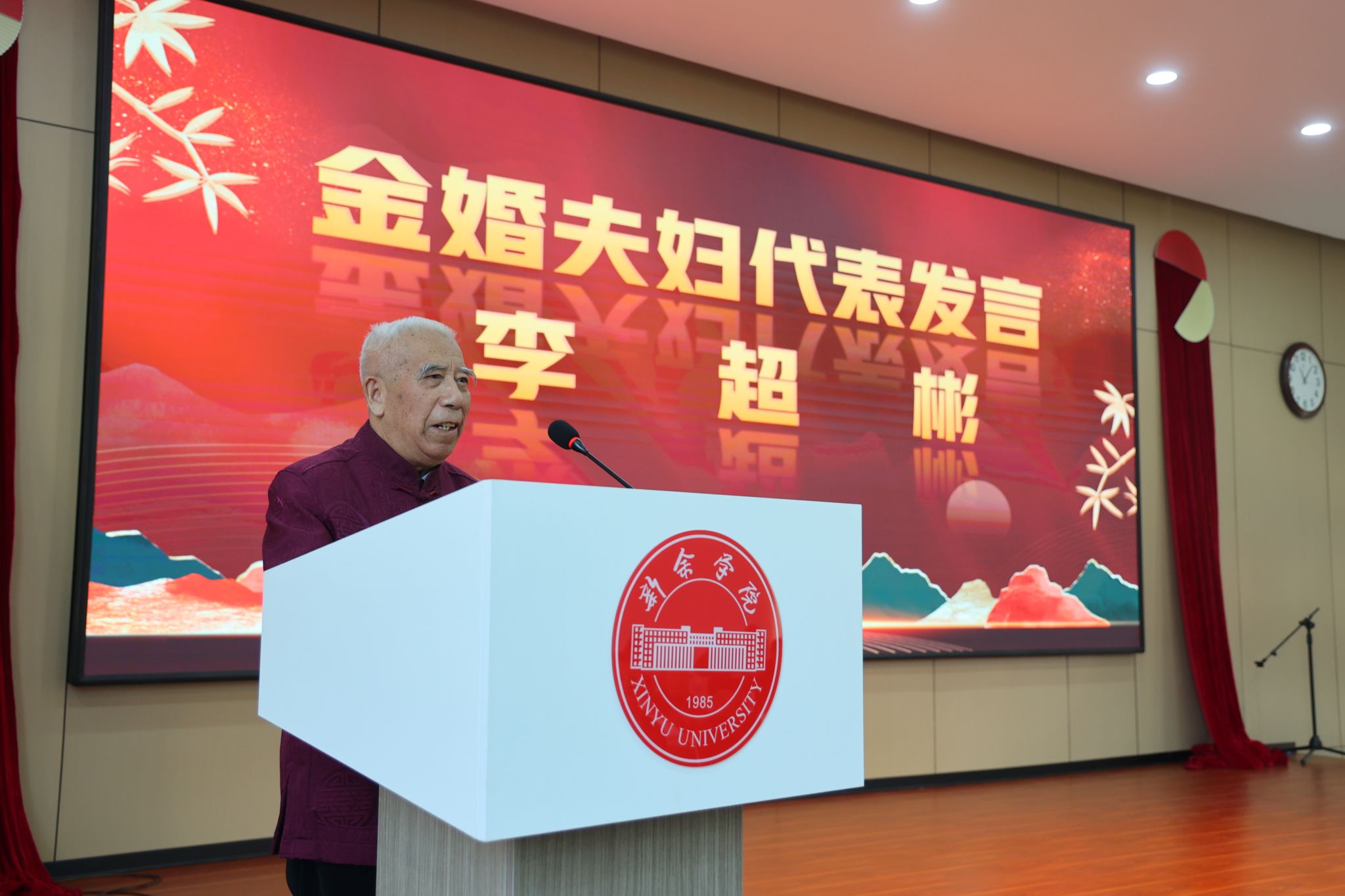 在金婚庆典上,伍复康向金婚伉俪赠送学校精心定制的专属纪念礼物,在致辞中代表学校党委、行政以及全校师生员工向各位老寿星、金婚伉俪,并通过他们向全校的离退休老同志致以最崇高的敬意和最诚挚的节日祝福。他表示,老同志是学校的奠基者与开拓者,是学校建设与发展的亲历者、见证者和贡献者。他们身上所体现的艰苦创业、爱岗敬业的优良传统,严谨治学、甘为人梯的师者风范,是值得永远学习的榜样,也是激励新一代新院人砥砺前行的强大动力。他为相濡以沫的金婚伉俪送上祝福,并表示,携手走过五十年风雨的金婚伴侣们共同谱写了感人至深的爱情篇章,树立了家庭和睦、婚姻美满的典范。他们将个人的幸福与学校的发展紧密相连,在建设好“小家”的同时,也为新余学院“大家”的繁荣兴盛贡献了力量。