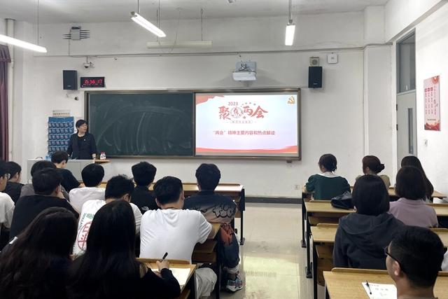 宣讲会上,徐忠麟围绕全国两会来龙去脉、政府工作报告主要内容、两会热点重点、两会期间习近平总书记的重要讲话等相关内容进行了全面宣讲和深入解读。他强调,今年的全国两会是全面贯彻落实党的二十大精神开局之年召开的一次重要会议,学习全国两会精神可以帮助同学们更好地了解国家的发展现状和未来的发展趋势,同时也能够提高政治素养和社会责任感。同学们要加强学习,增强本领,立志做有理想、敢担当、能吃苦、肯奋斗的新时代好青年,自觉把个人发展融入国家和人民的事业中,把个人抱负融入到中华民族伟大复兴的中国梦中。