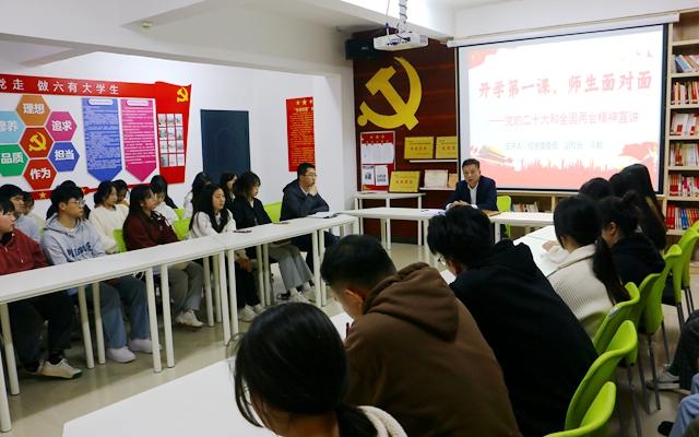 为全面学习领会贯彻党的二十大和全国两会精神,深入了解学生的思想动态、学习及生活情况,4月6日,校党委委员、副校长李敏在学生公寓党员工作站为外国语学院师生宣讲党的二十大和全国两会精神。外国语学院学生党员、入党积极分子、学生骨干代表共计40余人聆听了宣讲。