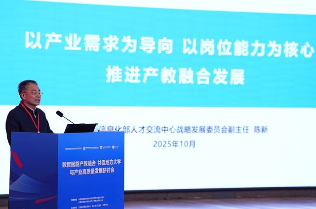 工信部人才交流中心原党委副书记陈新结合工信领域人才培养作《以产业需求为导向 以岗位能力为核心 推进产业融合发展》主题报告。报告围绕抓产业必须抓人才的理念,指出当前产业人才培养存在的痛点,提出地方高校可联合行业协会、人才服务机构,制定岗位能力标准,把企业技术难题转化为教学案例,同时依托校企双导师机制与人才大数据资源,实现人才服务与产教融合深度衔接。