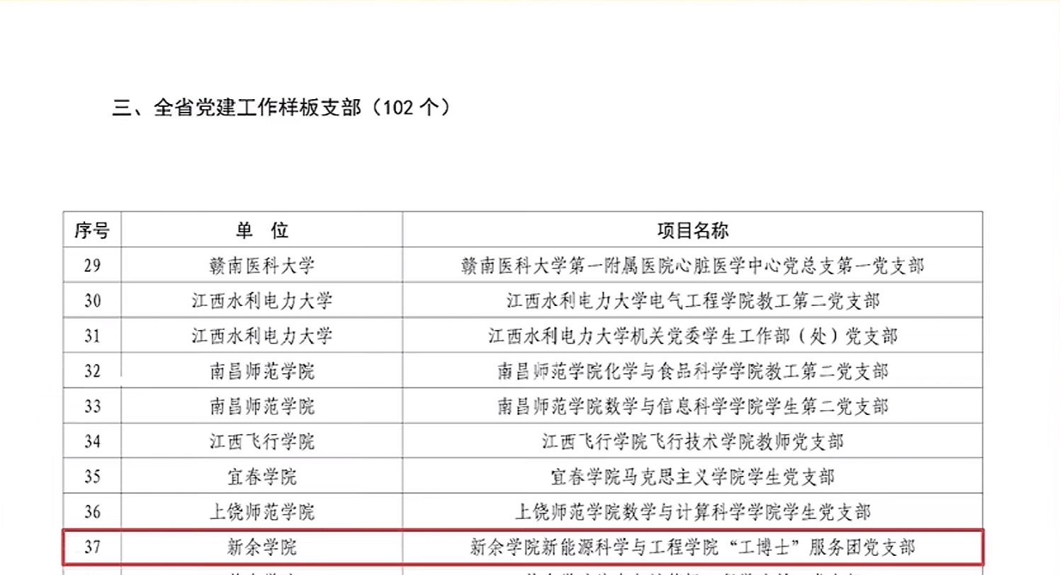 近日,中共江西省委教育工委公布了全省第二批新时代高校党建示范创建和质量创优培育创建单位名单。我校新能源科学与工程学院党委成功入选“全省党建工作标杆院系”培育创建单位,新能源科学与工程学院“工博士”服务团党支部入选“全省党建工作样板支部”培育创建单位。这是我校首次在省级党建“双创”工作中同时实现标杆院系和样板支部的突破,标志着学校党建工作取得新进展、迈上新台阶。