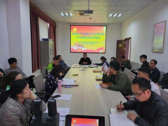 3月17日,体育学院党委在会议室召开全面从严治党工作会暨党史学习教育动员部署会,会议由体育学院党委书记、院长傅超主持。会议传达了学校全面从严治党工作会议暨当时学习教育动员大会的会议精神并组织学习了习近平总书记在党史学习教育动员大会上的重要讲话精神并对全院全面从严治党工作进行动员部署。