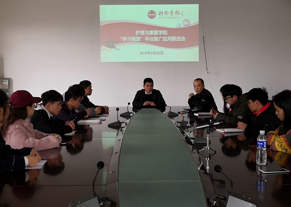 2月25日,护理与康复学院在该院一楼会议室召开“学习强国”平台推广应用推进会,对“学习强国”平台推广应用工作进行再安排、再部署。学院组织员、非毕业班团支部书记、团支部副书记(班长)、部分团委学生会干部参加。