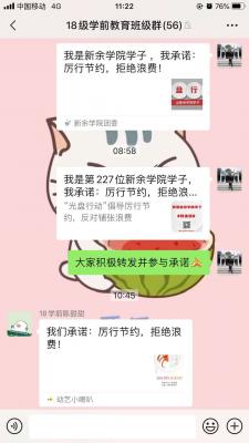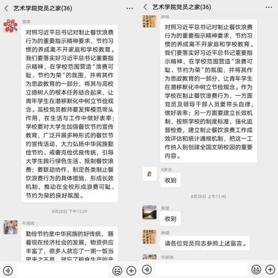 为深入学习指示精神,并确保学习取得实效,艺术学院师生通过线上集中学习和线下个人自学结合起来,学习范围覆盖学院全体教师、教工及学生党支部、班级团支部,广大师生党员通过微信群分享感受,各班级通过召开主题班会,进行倡议承诺。大家纷纷表示,从自身做起、从本职工作做起,坚决杜绝餐桌上的浪费,积极倡导“厉行节约,反对浪费”的社会风尚,投身全社会深入推进制止餐饮浪费工作。