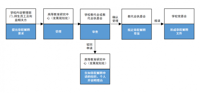 第七条 对经学校教代会或教代会执委会审查后确认驳回申请的,由高等教育研究中心(发展规划处)告知章程解释申请组织、个人并说明理由。