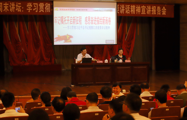 为深入学习宣传贯彻习近平总书记考察江西时的重要讲话精神,6月22日,我校在图书馆学术讲堂举办“周末讲坛”,江西省委党校副校长廖清成教授应邀来校作题为“牢记嘱托开启新征程 感恩奋进描绘新画卷——学习贯彻习近平总书记考察江西重要讲话精神”...