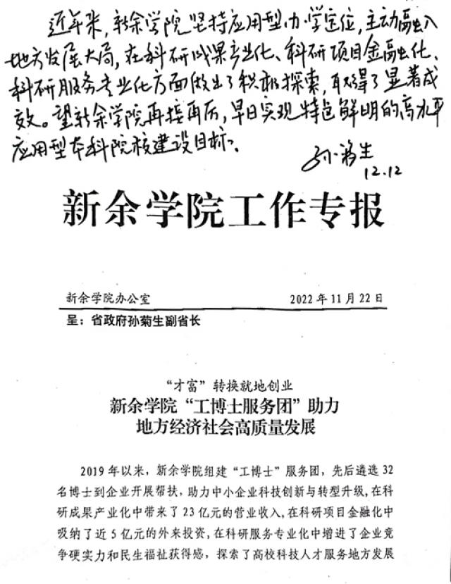 (文/党政办 廖林强)11月22日,新余学院以专报形式,就《“才富”转换就地创业——新余学院“工博士服务团”助力地方经济社会高质量发展》有关情况,呈送省政府副省长孙菊生。12月12日,孙菊生副省长作出了批示。批示指出,...
