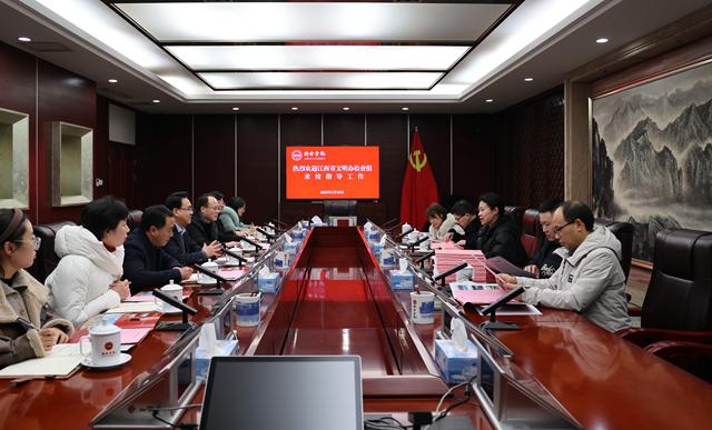 (图文/党委宣传部 廖勇)2月10日下午,由省委宣传部文明三处处长梁彦为组长的江西省文明办检查组一行3人来校,对学校2022年度文明校园相关工作进行复查指导,市委宣传部副部长胡永良陪同。校党委书记李明斌,党委副书记徐忠麟,...