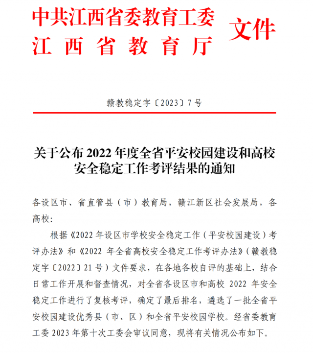 近日,江西省平安建设领导小组和省教育工委、教育厅印发了《关于公布2022年度全省平安建设考评结果的通报》(赣平安组发[2023]2号)、《关于公布2022年度全省平安校园建设和高校安全稳定工作考评结果的通知》(赣教稳定字[...