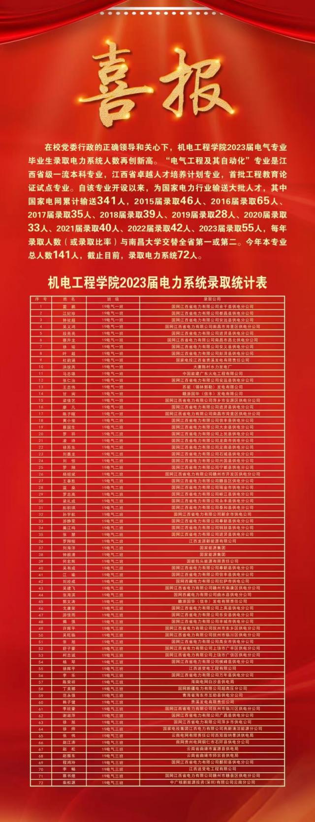 在校党委行政的正确领导和关心下,机电工程学院2023届电气专业毕业生录取电力系统人数再创新高。“电气工程及其自动化”专业是江西省级一流本科专业,江西省卓越人才培养计划专业,首批工程教育论证试点专业。自该专业开设以来,...