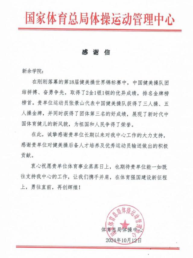 10月12日,国家体育总局体操管理中心向我校致感谢信,对我校体育学院青年教师张景山代表中国健美操队获得了三人操、五人操金牌,并同时获得了团体第三名的好成绩给予了高度评价和感谢。 感谢信中提到:“贵单位运动员张景山代表中国健美操队获得了三人操、...
