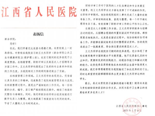 近日,江西省人民医院给我校发来表扬信,对我校公共卫生与健康学院21级护理学1班王文杰同学在实习期间的优异表现予以赞扬,对我校在教育教学方面的高水平与高质量表示充分肯定。 表扬信中提到,王文杰同学不仅具备扎实的专业知识,...