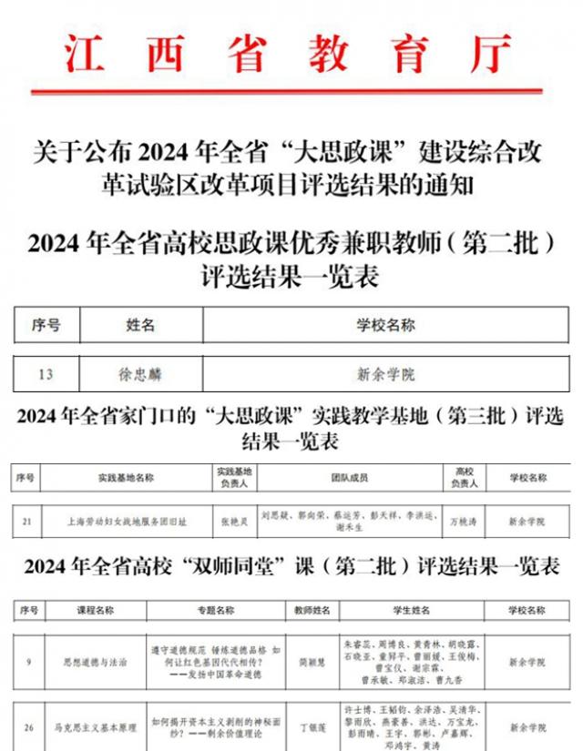 近日,江西省教育厅公布了2024年全省“大思政课”建设综合改革试验区改革项目评选结果,我校申报的4个项目成功获批。 徐忠麟教授获评“江西省高校思政课优秀兼职教师”;马克思主义学院刘思疑团队申报的上海劳动妇女战地服务团旧址基地获批全省家门口的“...