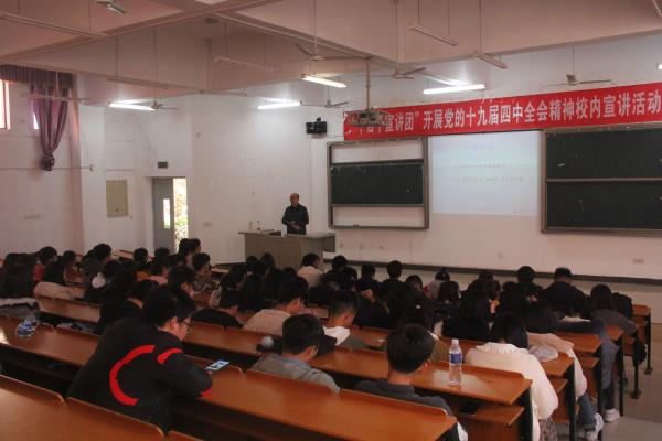为扎实推进党的十九届四中全会精神的学习宣传贯彻工作,根据相关文件要求,12月10日下午,经济管理学院在文A多媒体教举行党的十九届四中全会精神校内宣讲活动。本次活动由马克思主义学院李洪运博士主讲。李洪运从认识十九届四中全会的历史地位及重要意义,...