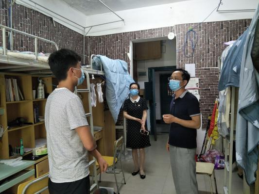 为了解数计学院首批返校生的在校情况,5月18日下午,该院党委书记、院长胡焕然,党委副书记谭玲和班主任代表一起来到学生寝室看望慰问学生。在学生宿舍,胡焕然仔细询问了同学们的学习生活情况,告诉他们宿舍已全部消毒并通风,...