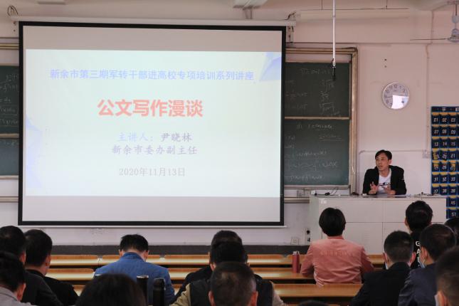 11月13日下午,新余市第三期军转干部进高校培训班专题讲座在我校开展,讲座以 “公文写作漫谈”为主题,由市委办副主任尹晓林主讲。军转干部培训班全体学员,市人力资源和社会保障局相关干部,以及文学与传媒学院部分师生共计100余人聆听了讲座。...