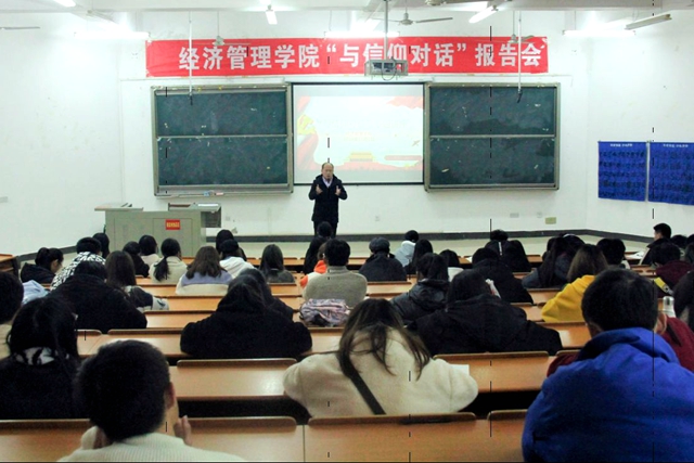 12月2日,经济管理学院于文A多媒体开展以“与信仰对话·为清楚你导航”为主题的报告会,经济管理学院周来友老师主讲,参会人员有经济管理学院十一届学生会全体成员和各班班委成员。周来友首先抛出问题“什么是信仰”,...
