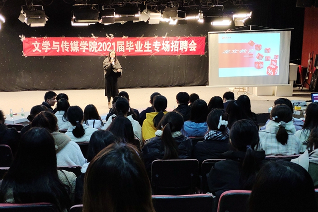 12月19日晚,文学与传媒学院在文E演播厅举行2021届毕业生专场招聘会,三家用人单位受邀宣讲招聘,该院党委书记、院长刘君君,副院长周露以及全体2021届毕业生参加。文传学院为师范类毕业生分门别类、精心挑选了三家教育企业,...