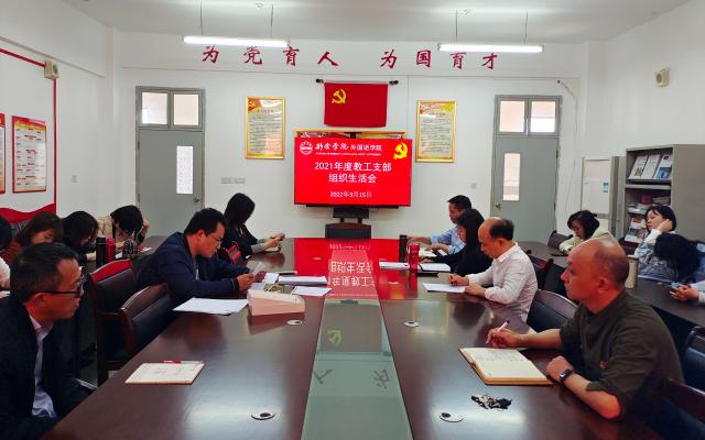 3月15日下午,外国语学院教工党支部召开了2021年度组织生活会。外国语学院党委书记、院长刘华东和其他党委班子成员均以普通党员身份参会。组织生活会由教工党支部书记黄赤强主持。黄赤强代表支部委员会向与会党员报告了2021年教工党支部工作情况及组织生活会和民主评议党员工作准备情况,...