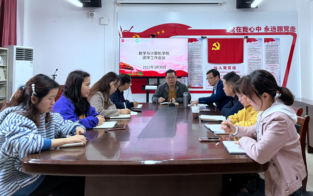 3月30日上午,数学与计算机学院召开团学工作会议,旨在进一步加强辅导员队伍建设,推进和落实共青团和学生工作各项任务。该院党委书记、院长刘志龙主持会议并讲话,该院党委副书记黄新仁,党委委员、副院长徐照胜分别做工作部署,...
