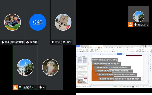 12月1日,国际处与菲律宾圣保罗大学中国区代表举行了视频会议。会议介绍了我校的办学历史、办学特色等基本情况,表达我校将坚持扩大对外开放,通过师生的交流学习、招收国际学生、交换生项目、联合培养硕士项目、青年学生夏令营等方式,...