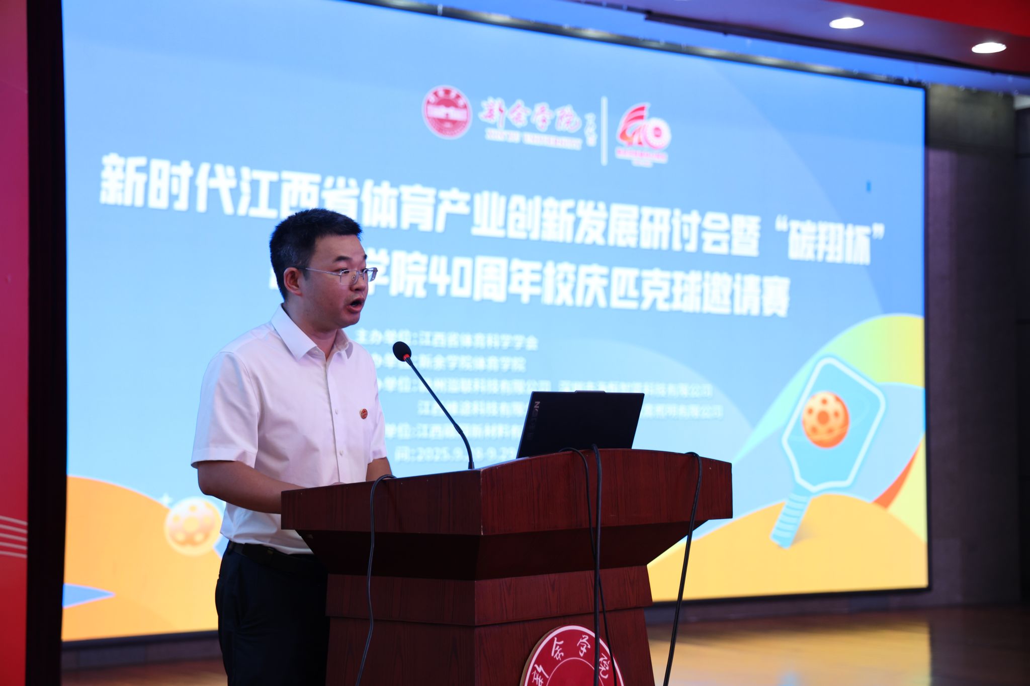 9月28日-29日,新时代江西省体育产业创新发展研讨会暨“碳翔杯”新余学院40周年校庆匹克球邀请赛在我校举办。新余学院党委委员、副校长黄益宾出席开幕式并致辞。江西省内20余所本科高校体育学院院长以及江西省体育产业协会、江西省足球协会、江西省木球协会、江西碳翔新材料有限公司、赣州溢联科技有限公司、江西维途科技有限公司和深圳尚为智慧教育照明有限公司等20余家行业企业代表和师生代表共计260余人出席会议。大会分别由南昌大学体育学院院长江广金、江西师范大学体育学院院长贺新奇、江西科技师范大学体育学院院长舒川和新余学院体育学院院长傅超主持。
